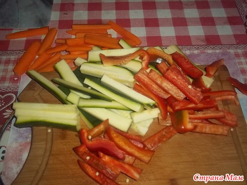 1 баклажан, 2 цуккини, болгарский перец, морковь нарезаем одинаковыми брусочками