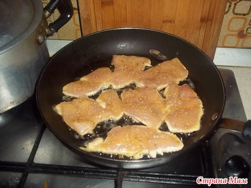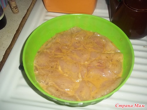 Курочку ( у меня филе ) лучше всего замариновать заранее, она вся пропитается