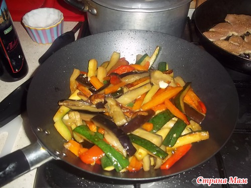 На фото нет баклажанчика, мы его положили в холодную подсоленную воду, чтоб вышла горечь, так как от шкурки не очищали