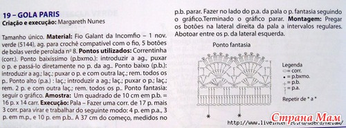 Набираем цепочку из 17 в. п. eщe 3 в. п. для подъема, поворачиваем работу 4 ст. с н, 3 п. ст с н,10 ст. б н. Продолжаем вязать пока не достигнем 37 см от начала вязания, тогда поворачиваем работу и обвязываем фантазийным узором по схеме низ манишки. Распределить и пришить 5 пуговиц, связать для них петли на другой стороне.