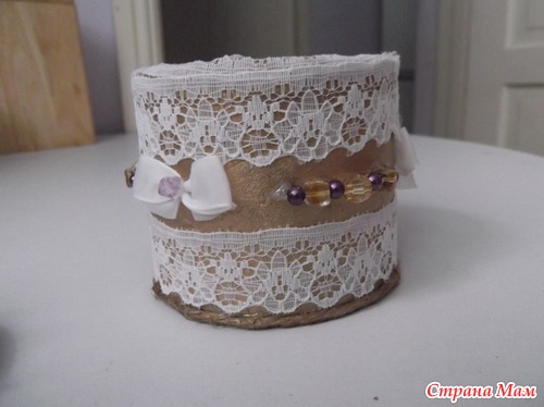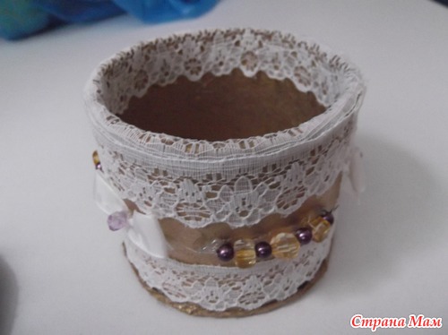 Это была первая проба - бобина от скотча, внутри оклеена тканью, Дно - картон, снаружи - на клей ПВА бечевка.