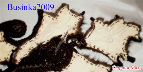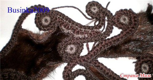 Далее 2 петли подъема, столбик с накидом, спереди крючком обхватывая меховую ленту (тогда мех плотно обхвачен), 1воздушная петля, и так до конца ряда чередуем.