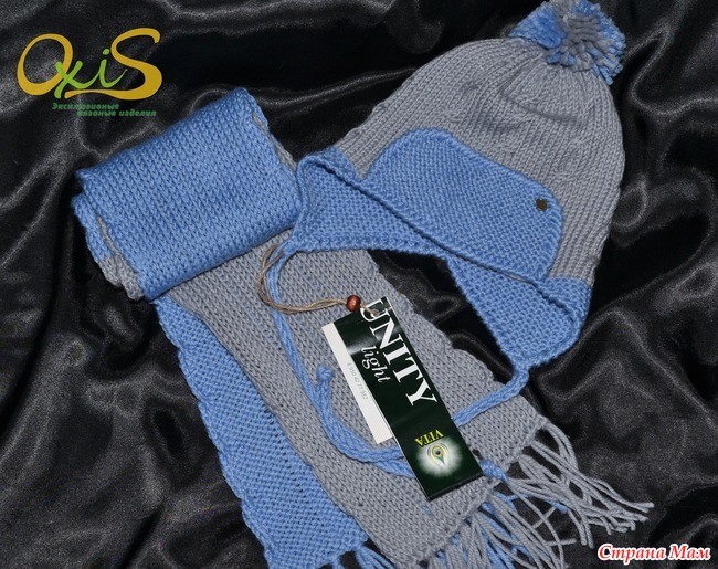 Заказали мне шапочку для маленького мальчика, изначально была мысль связать спицами, маленькая же, вроде быстро, но когда я связала "козырек" и "ушки", взбрела в голову мысль, все это навесить на игл машинки и связать уже дальше на машинке, так и сделала. Немножко поизголялась с "косами", макушку закрывала на спицах, подклад связала тоже на машинке. и еще шарфик, ну его тоже быстренько на машине, а край оформила косичкой 2-2.