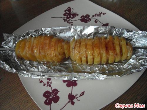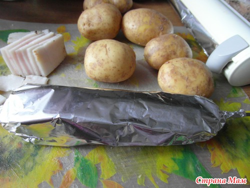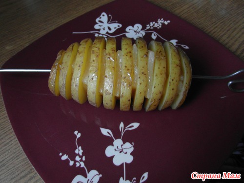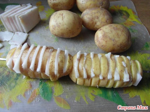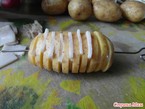 -нанизываем поочередно ломтики картофеля и сала на длинную шпажку...