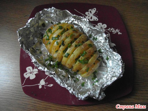 "+" - в том, что в фольге долго остается горячим и запоздалым гостям тоже достанется горячее