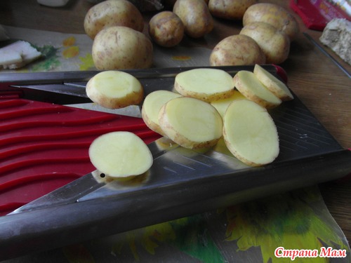 "-" - сало очень много... надо или толще резать картофель... или соло резать совсем тонко... по возможности заменить беконом...