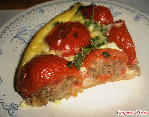 Открытый пирог из тонкого теста с помидорами, фаршированными мясом и луком...