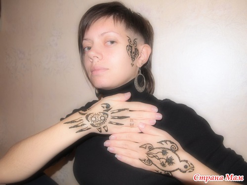 Как то у сотрудницы дочь замуж выходила за тунисца, свадьба была соответственно в Тунисе, так ей расписали руки и лицо - правда она такого не вынесла, с лица все убрали, оставили немного красивых узоров на руках... цвет был темно-коричневый, она сама белокожая с темными волосами... ей очень все шло , фотки были изумительные.