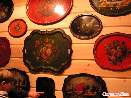 А мы сегодня были на экскурсии в д. Жостово, в той самой где расписываются подносы необыкновенной красоты! При самой фабрике открыт музей: 2 небольших зала, все стены которых увешаны подносами: от самых старых до новейших. Детям показали небольшой фильм об истории фабрики, о том как заготавливают подносы, как их расписывают.