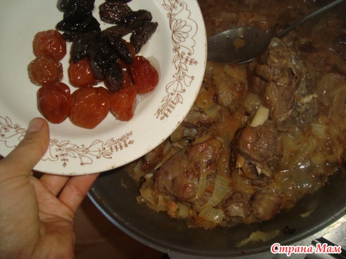 Отдельно пожарим лук полукольцами и добавим к мясу, затем сушонести, чернослив и альбухару