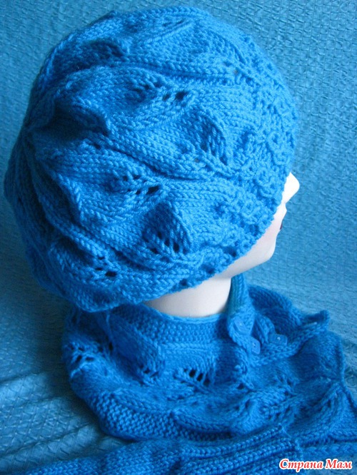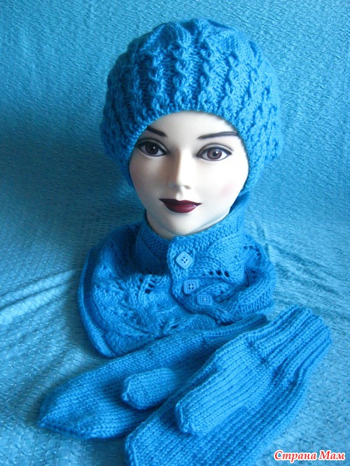 В комплект входят: берет (54-58 см), шарф-воротник и варежки.