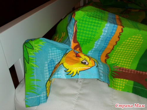 На простыне прошила уголки так как оч трудно подтыкать простынку под матрас плотно прилегает. хотела сделать простыню на резинке но резинки пока нет а с уголками в разы стало удобнее заправлять и даж как то аккуратнее.