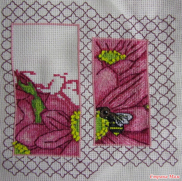 Спасибки надо сказать автору схемки, мне очень нравится, результат процесса вышивки очень радует уже сейчас. Единственное, мне кажется нужно было вышивать на очень светло-зеленой канве, думаю по окончанию вышивки полукрестом вышить фон светло-зелеными ниточками. Это я к тому, что в идеале сюда бы паспарту с окошками, но расстояние между окошками маленькое, поэтому фон или зашивать или брать цветную канву. Но это мое мнение, может я не права