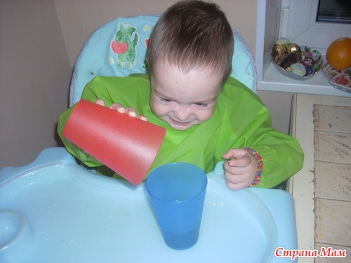 Переливали водичку из стаканчика. Стаканчики, правда, великоваты, поэтому много воды пролилось мимо, но Егорке занятие понравилось