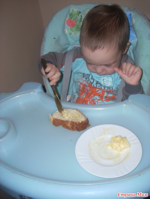 Начали с приготовления завтрака. В доме не оказалось ни одного ножа с тупым концом, пришлось на свой страх и риск дать обычный с зубчиками. Егорка периодически пытался схватить нож за лезвие второй рукой и ножом тыкал в кусочек булочки, вместо того, чтобы размазывать масло. Но съел с удовольствием