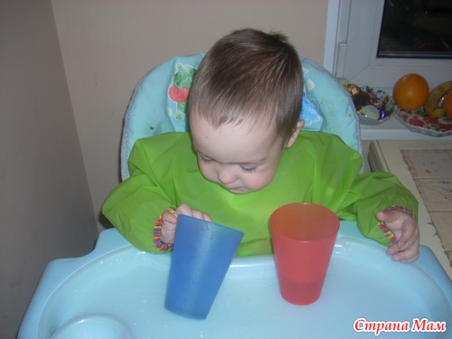 Переливали водичку из стаканчика. Стаканчики, правда, великоваты, поэтому много воды пролилось мимо, но Егорке занятие понравилось