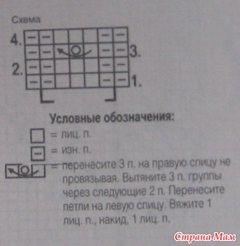 3 ряд: * 2 изнаночные, 3 лицевые, 3-ю лицевую петлю раппорта перекидывают влево через 4-ю и 5-ю лицевые петли *, 2 изнаночные;