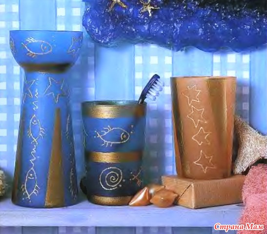 Вроде бы все просто. Например, стаканчики в ванную комнату - чтобы полоски получились ровными, наклеиваете скотч, раскрашиваете, ждете,пока высохнет. Потом контуром рисуете рыбок, морских звезд. Проще не бывает, зато как оригинально!
