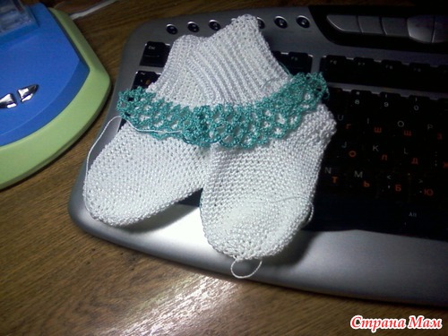 Вот носочки. А вот начала вязать косынку таким же узором, как и платьице. Но, чего-то мне не нравится...