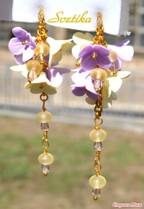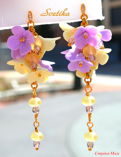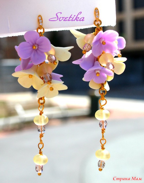 Сиреневые и нежно-лимонные цветочки в россыпи чешского хрусталя. Каждый цветочек создан моими руками из полимерной глины. Цветочки нехрупкие, не боятся воды, мороза и солнца. Длинные, но воздушные серьги на застежках-пуссетах.