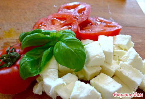 2. Рубим некрупными кубиками моцареллу, режем помидоры кружочками, примерно пол см толщиной