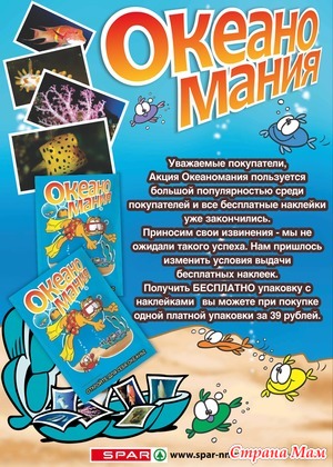 Девочки, сейчас в магазинах Спар проходит акция, за покупки дают наклейки с морской живностью! Кому не нужны или есть лишние наклейки давайте обменяемся, очень нужны нам в альбом, нам много не хватает!!!