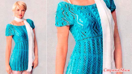Туника связанная спицами с фантазийным сочетанием великолепных ажурных узоров выполнена в стиле ампир, о чем говорят завышенная линия талии и короткие рукава.