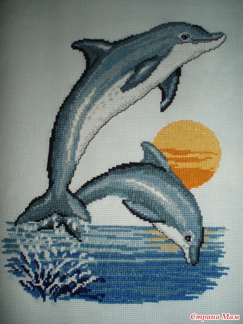 эта фотография лучше.Мне случайно попалась вышитая картинка этих дельфинов в инете. Я долго искала схему. Девченки на майле помогли найти. Вот вышила. Виси над дочкиной кроватью.
