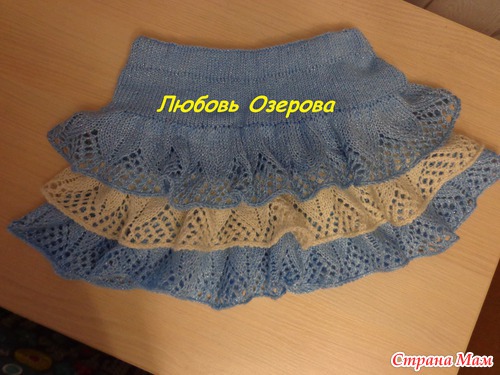 Юбочка на 2-3 года. Пряжа акрил с люрексом. Ушло чуть больше моточка 430м/100г, точнее моток голубой пряжи и немного белой. Спицы №2.