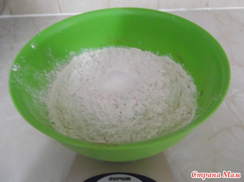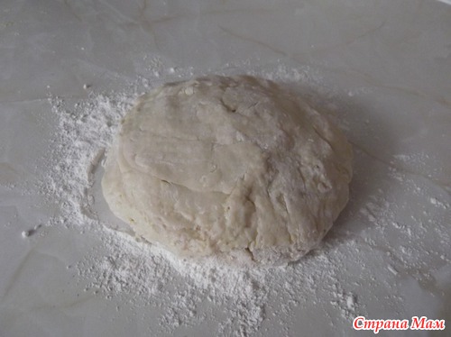 Быстро замешиваем тесто - я замешиваю его силиконовой лопаточкой и в самом конце руками. Тесто получается мягкое и эластичное. Не сильно, но прилипучее, так что хорошо подсыпаем стол мукой.