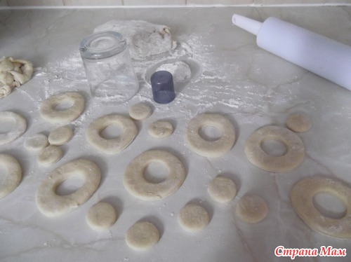 Раскатываем тесто толщиной пол сантиметра и вырезаем кружочки с дыркой