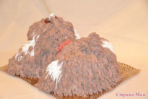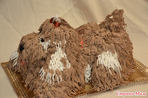 внутри торт как всегда-в данном случае шококипяток с крем брюле-а шерстка из взбитых растительных сливок, подкрашенных(я их очень люблю и вкусные и форму держат и хранятся долго) я тут взяла насадку( нужно себе такую купить, а то вернуть надо)-как наперсток с дырочками