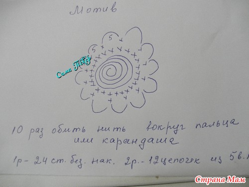 Пряжа х/б, немного толще и жестче ириса. Название уже не помню, т. к. они уже очень давно у меня. Я из них уже вязала жилет мотивами, есть в этой же рубрике. Крючок № 1.