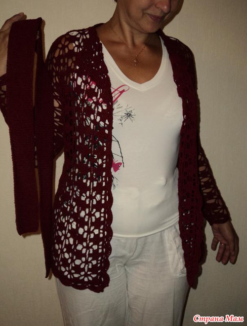 Спинка: крючком № 3,5 связать цепочку из 88 (101) возд. п. + 1 возд. п. подъёма и связать 1 р. ст. 6/н. Затем вязать крючком № 4 основным узором А. Через 60,5 см = 46 р. (66 см = 50 р.) от наборного края работу закончить, при этом в последнем ряду вязать 3 возд. п. вместо 8 возд. п.