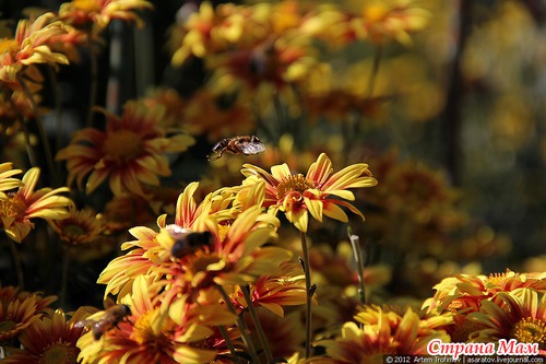 Пчелы не упускают возможности собрать последний нектар этой осени. Их можно увидеть практически на каждом цветке.