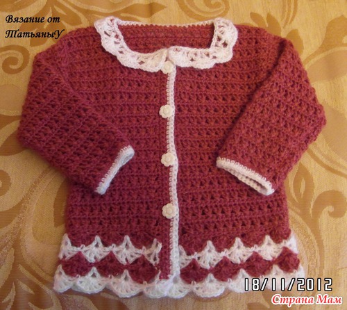 Кофточка для девочки. Вязала нитками Ангора Рам 100г/500м. Расход менее 1 моточка + немного белых для отделки. Крючок № 3.