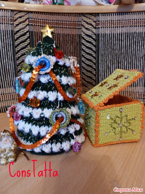 Но тут возник другой вопрос: где же хранить всю эту съёмную красоту? Нужны, конечно же, нарядные сундучки для игрушек! В ход пошли картонные коробки от молока, обвязанные столбиками без накида и украшенные вышитыми снежинками и пайетками. Закрывается сундучок на пуговицу, что дает работу детским пальчикам ))))