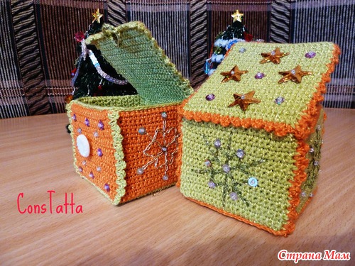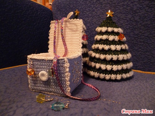 Но тут возник другой вопрос: где же хранить всю эту съёмную красоту? Нужны, конечно же, нарядные сундучки для игрушек! В ход пошли картонные коробки от молока, обвязанные столбиками без накида и украшенные вышитыми снежинками и пайетками. Закрывается сундучок на пуговицу, что дает работу детским пальчикам ))))