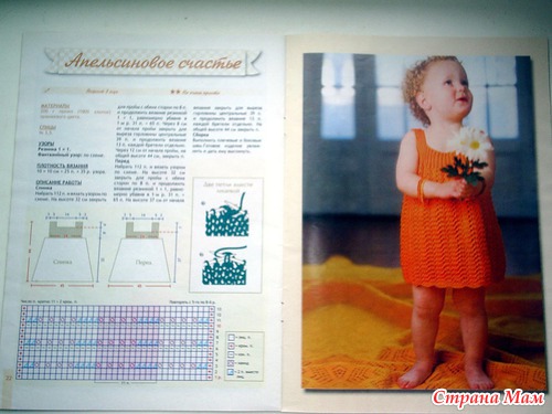 Для вязания платья вам потребуется: 200 г пряжи (100 % хлопок) оранжевого цвета. Спицы №3,5.