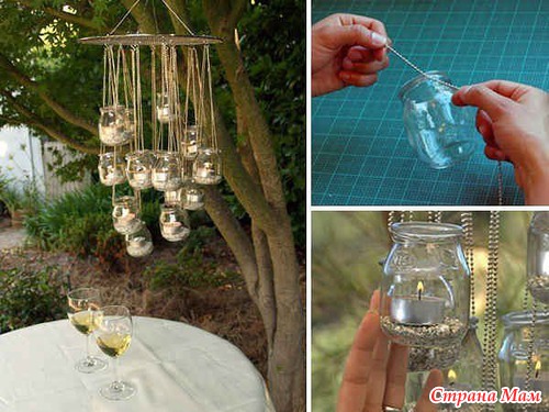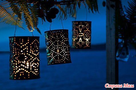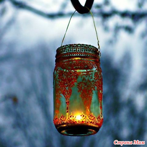 Вот так можно использовать обычные банки вместо светильников, для пожарной безопасности в банки можно поместить маленькие свечки.