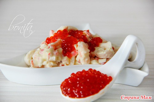 Салат смазываем майонезом и добавляем икру непосредственно перед подачей в салат и для украшения. Приятного аппетита!