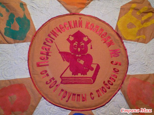 И родилась идея сделать панно с отпечатками наших ладошек и вышивкой логотипа колледжа в центре.