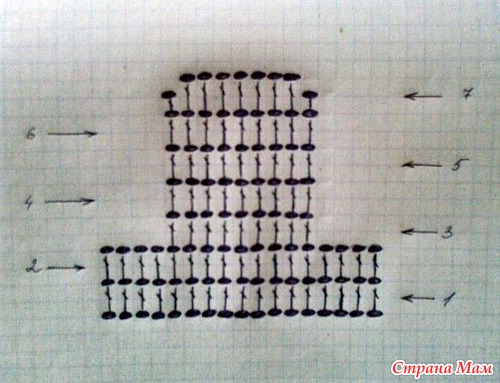 Взгляните на схему. Как правило, для всех пинеток подошва вывязывается отдельно. Такая схема пинеток Кеды крючком наглядно показывает, сколько нужно набрать петель и какими столбиками вязать. В данном случае работаем столбиками с накидом.