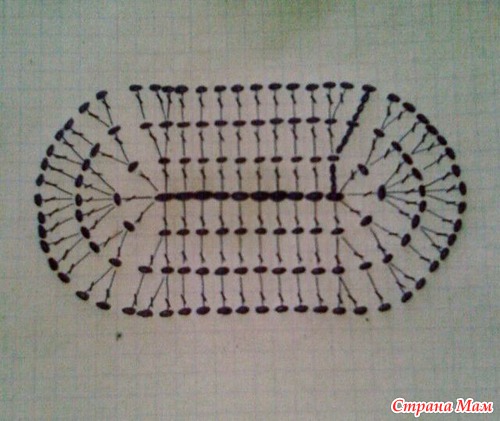 Взгляните на схему. Как правило, для всех пинеток подошва вывязывается отдельно. Такая схема пинеток Кеды крючком наглядно показывает, сколько нужно набрать петель и какими столбиками вязать. В данном случае работаем столбиками с накидом.