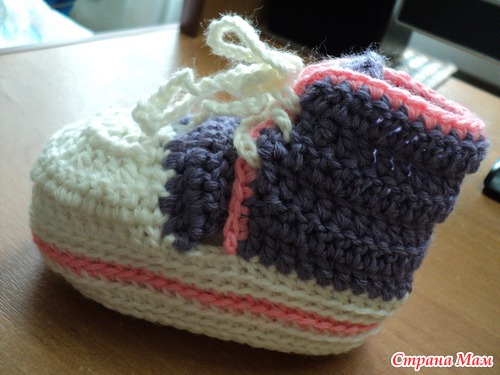 Теперь вяжем бока нашим кедам, отступая по 2 петли с обеих сторон от носочка.