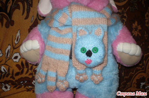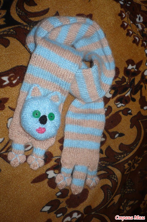 МАлышам и их МАме так понравились носочки, что попросили еще шарфик, только голубенький... а голубых ниточек оказалось - кот наплакал... вот и пришлось - плакать, но вязать шарфик на 5 спицах их мохера... не судите строго, сама смеюсь над мордуленцией кота...))))
