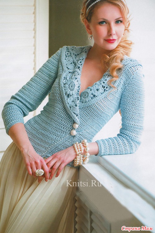 Вам потребуется: 750г голубой пряжи (50 % хлопок, 50 % вискоза, 450м х 100 г); крючки №2 и № 3; игла; две пуговицы.