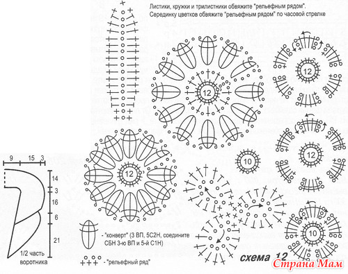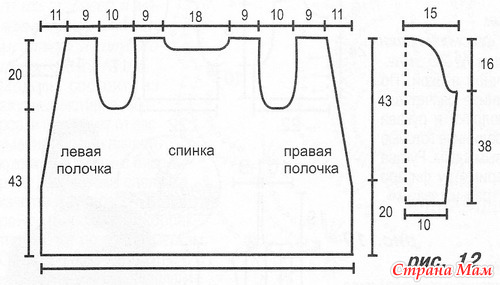По образцу и выкройке сделайте расчет вязания. И еще, даже если расчет с точки зрения теории выполнен правильно, не забудьте в процессе вязания как можно чаще прикладывать полотно к выкройке для контроля и корректировки размеров изделия. Для спинки и полочек крючком №3 выполните плоский шнур необходимой длины (см. выкройку) и вяжите по нему крючком № 2 основным узором. Плоский шнур: вяжите крючком № 3 нитью в 3 сложения и крючком № 2 нитью в 2 сложения. Свяжите цепочку из 3 ВП, затем в 1 -ю ВП свяжите 1 СБН.