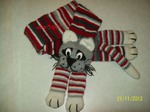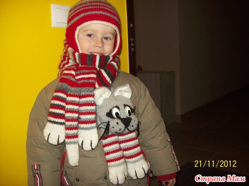 Здравствуйте. Наш первый котошарф и дебют, спасибо мастер-классу и другим работам форумчанок. Очень долго решались вязать-ли красного кота? У нас была связана уже красная шапочка с серыми полосками, но вот, что получилось: