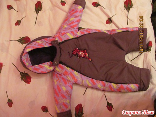 Вблизи не фотала, потому что много ошибок. Верх плащовка, синтипон 150+150, флис. Рукава вышли узковатые, а штанины коротковатые, потому что викройку брала 74, когда он имел рост 65-68, но пока пошилось... вырос. И капюшон дошивала. В настоящий момент буду делать в рукавах вставки, и дошивать манжеты на штанины.
